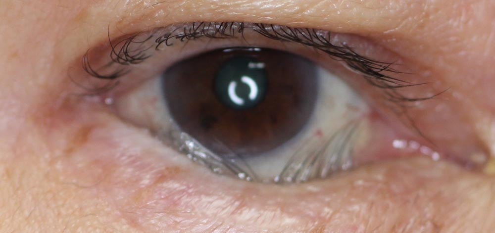 加齢性が原因にて、睫毛が黒目にあたり角膜にきずがついているため、眼科から紹介受診されました。
