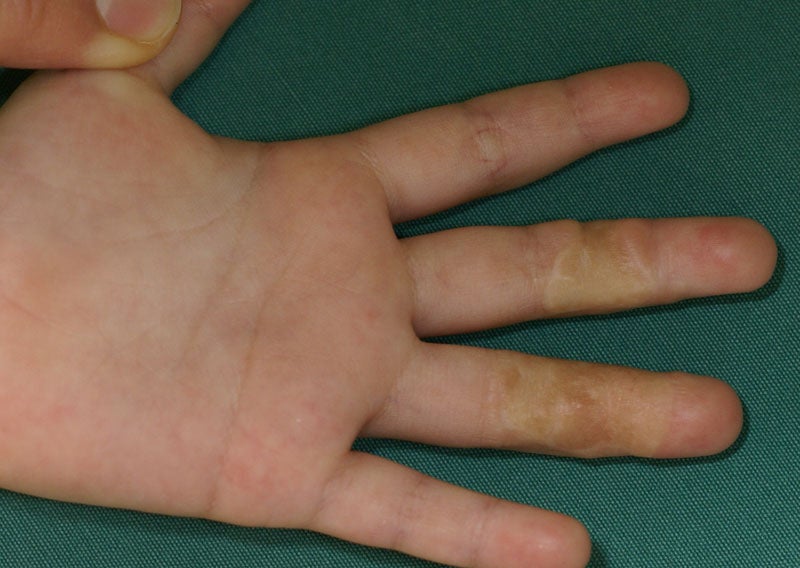 下の症例は、1歳のお子さんで熱湯で右手中指と薬指をやけどしました。